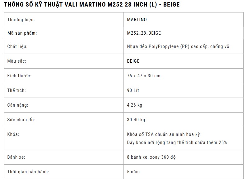 Với thiết kế màu be năng động và tính năng an toàn cao, Vali Martino M252 28 Inch là ứng cử viên số 1 cho những chuyến đi đòi hỏi sự chuyên nghiệp và linh hoạt.